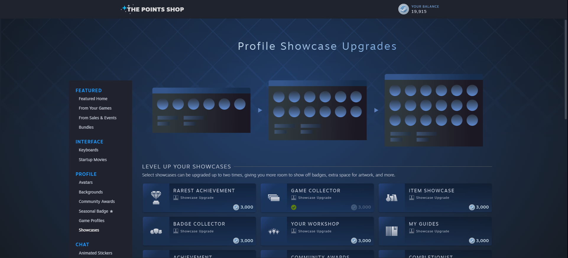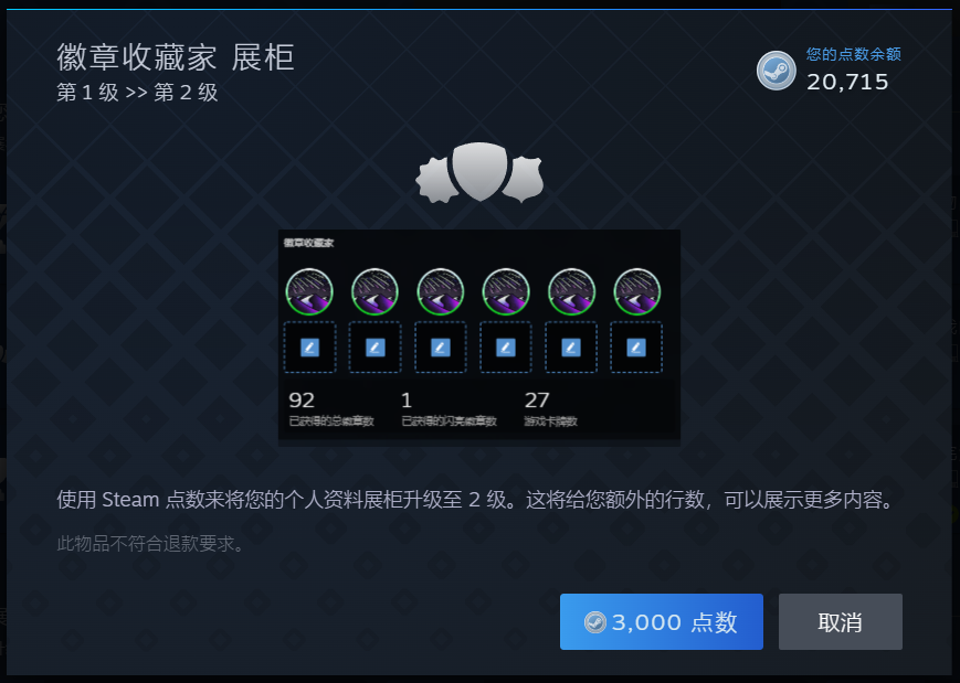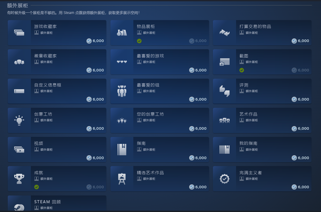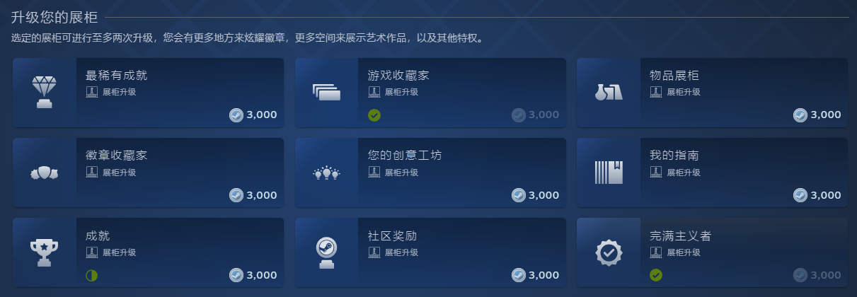 或者有人觉得升级等级很麻烦/不想额外购买卡片合成徽章来升级steam等级,就可以想好自己想要什么展柜展示效果,直接购买相对应的展柜。