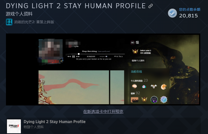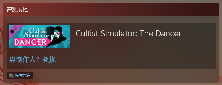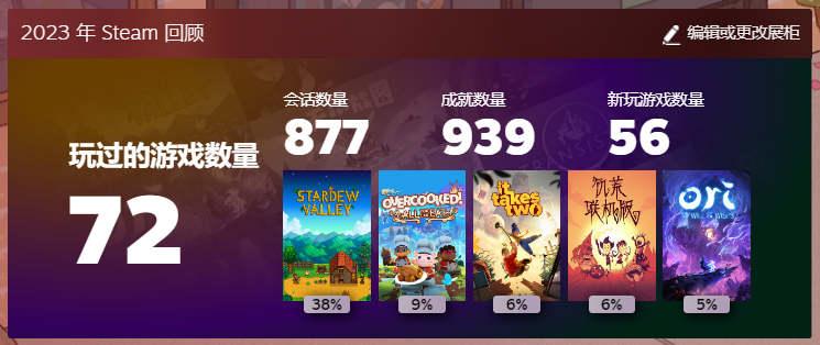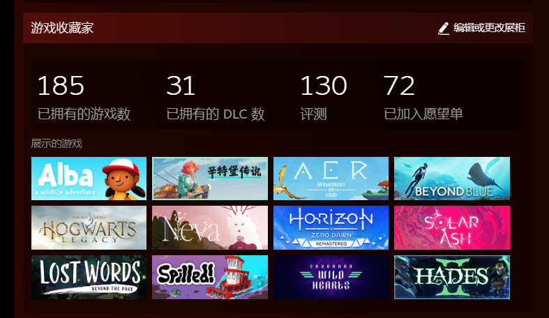 可以展示已拥有的游戏/dlc/评测/愿望单,并且可以选择把自己喜欢的游戏放到主页进行展览。我的这个展柜是三级效果,一级的只能放入四个游戏。
