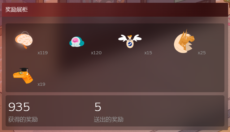 可以展示你收到过什么奖励。但是如果买过点数的话就会出现我这种情况xddd超多数量的奖励,根本不知道哪些是真的评测送的。对小丑猎人来说是一个不错的展示位!