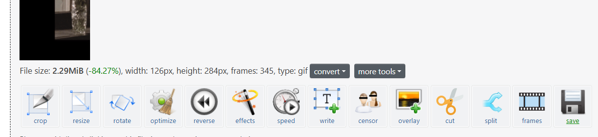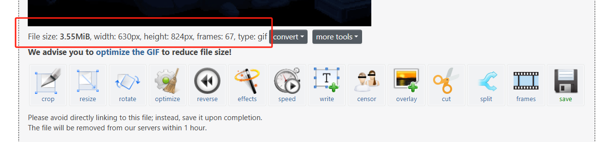 - 使用:https://ezgif.com/ 将这个mp4文件转化为gif。选择Video to GIF,上传视频文件。注意确认size要选择原始大小,随后保存。
