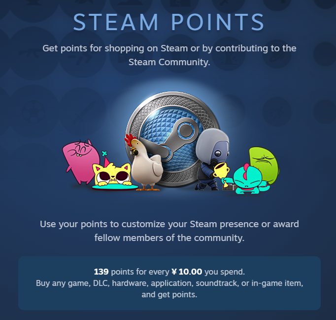 - 在steam上购物:有点类似于商场的购物积分,以国区为例,购买一款售价为10元的游戏可获得139点。