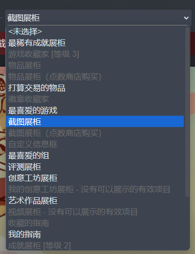 另外,像创意工坊展柜、艺术作品展柜、截图展柜这种,有的盟友可能会发现自己的是灰色的无法点击。这是正常的,因为你的创意工坊、艺术作品、截图等地方没有上传过内容。先上传再来选择就可以了。
