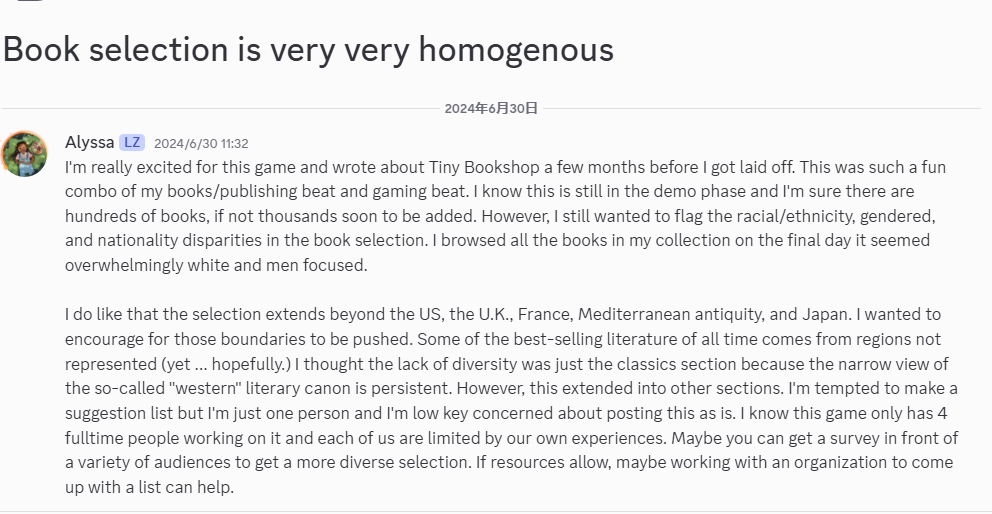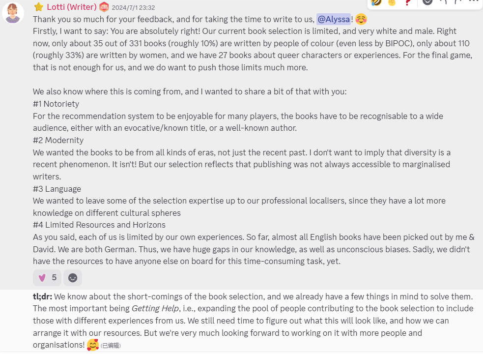 另外,我在浏览过往建议记录的时候看到也有人提到里面的书籍选品白男作家较多,女性的作品相对较少。制作组也对此进行了回应。因为看到这个建议蛮感动的,感觉世界各地的女性都在往前走,所以也贴一下这条吧: