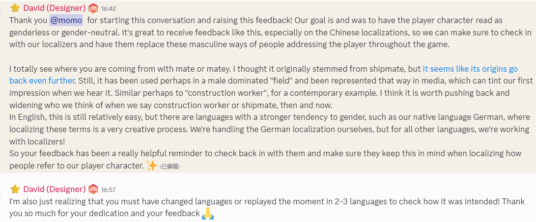 更新:最近重玩demo发现里面有一个水手的用词是“老兄”,去问了制作组,制作组说会和本地化团队沟通,避免这种带有性别含义的词汇。感觉制作组还蛮用心的。放一下制作组回应: