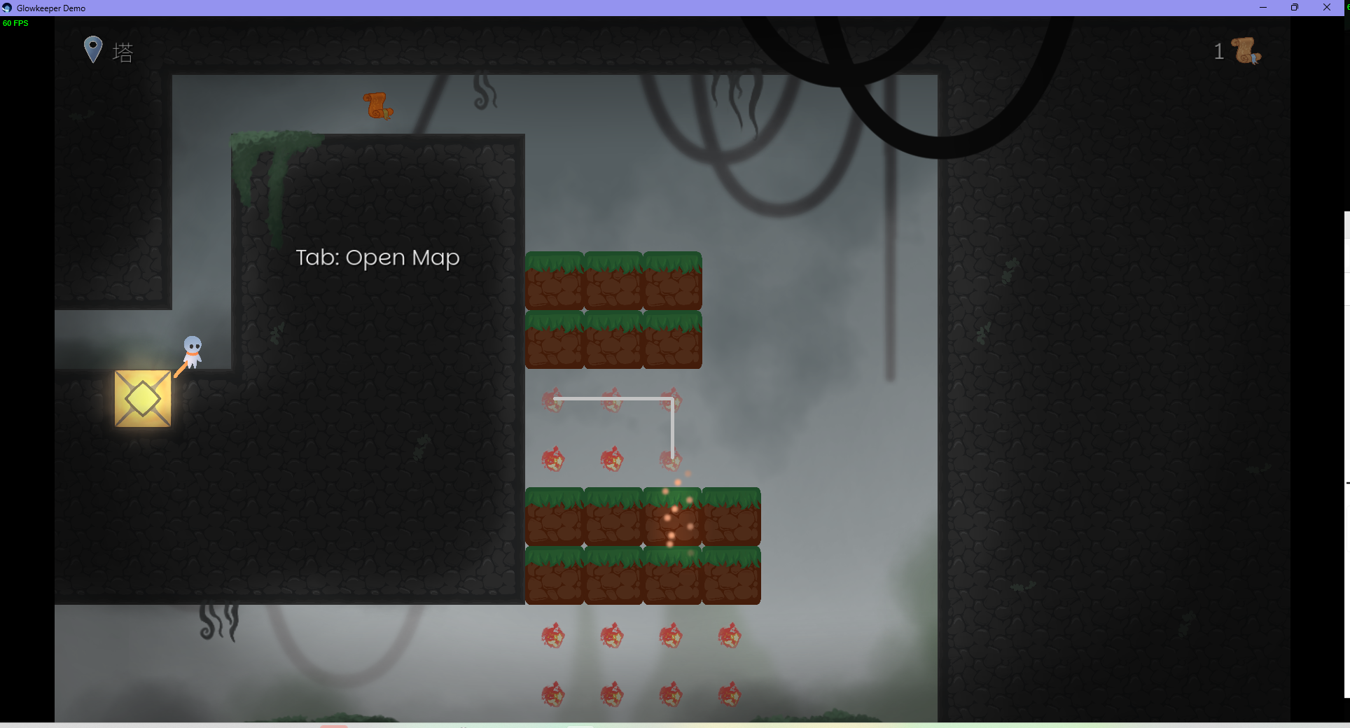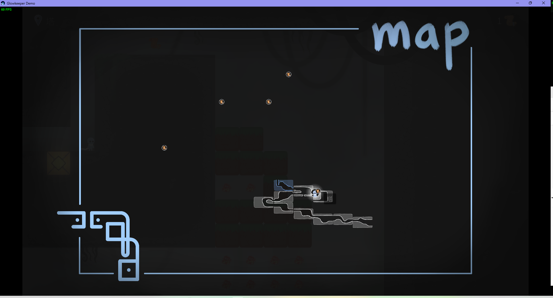 游戏有点类似于一笔画三消解谜?我看打开地图好像还有点想做类银河城的样子。玩法就是通过一笔画消除同种类型的物品来进行平台跳跃。有点别扭的是跳跃是W。