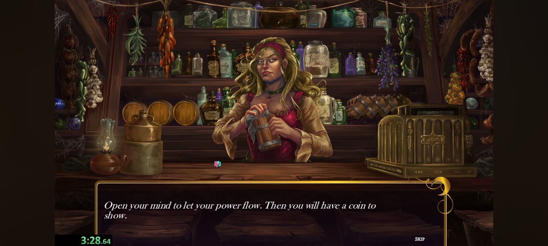 游戏性一般,主要玩法就是会有人告诉你一个咒语的一点提示,然后你根据提示选出最多四个咒语元素并且按照正确的顺序放好。但是如果错过这一句话提示的话就会陷入无穷无尽地穷举……反正我是举崩溃退出了。