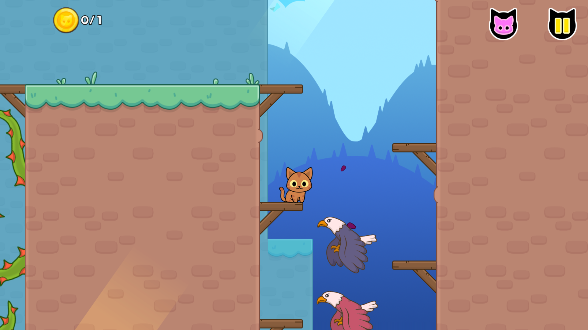 其实就是平台跳跃游戏。可以借助小鸟进行二段跳。里面的画面做得还蛮有意思的,小猫吃小鸟来跳跃,也会被老鹰抓走重开。跳跃不太连贯有点卡手,但习惯了就还好。整体难度不大,打得比较轻松。