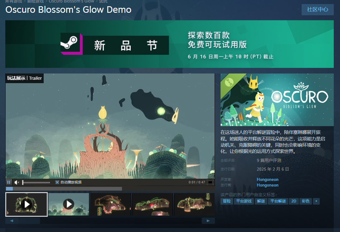固定女主角游戏。玩法有一点点让我想起GRIS。平台跳跃+解谜,跳跃手感做得有点奇怪但是适应一下也还能忍。画风蛮漂亮的。吸收并释放花朵的光芒来激活隐藏机制。