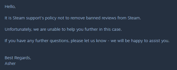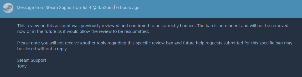 You will not receive another reply regarding this specific review ban and future help requests submitted for this specific ban may be closed without a reply.