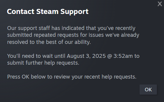 which means Steam 直接封禁了我的申诉通道整整一个月,期间我 无法就任何问题寻求帮助。 哪怕我遇到账号被盗、游戏出问题、误操作充值,都无法联系客户进行申诉。Steam,这就是你们的客服处理吗?解决不了问题,就让提出问题的人闭嘴吗?这怎么不算一种堡组呢:) 对此我想问:Steam 是否滥用了平台规则?