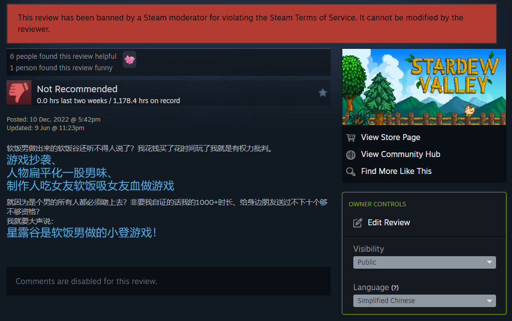 (而且很奇怪的是,这条评测是22年的旧评测修改为差评。steam的评测系统机制仅会显示most helpful reviews in past 30 days, 而所有评测不论如何修改都仅计入最初修改的时间。所以这条评测不应当在商店页面能看到,那它是怎么被版主精准定位并秒封的呢?)