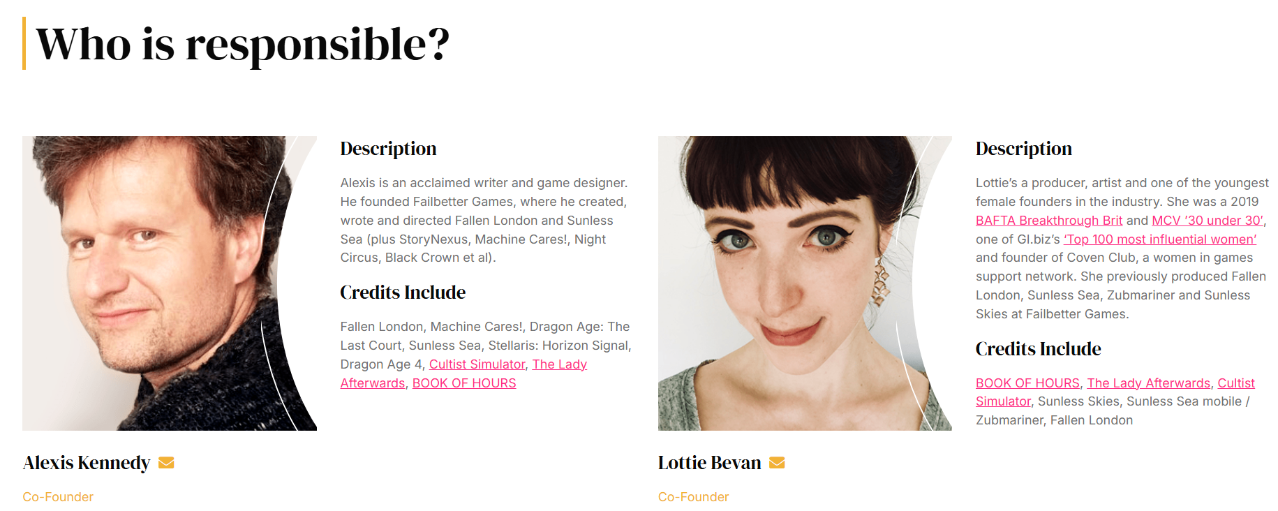 官网可以查询到公司的两位制作人:Alexis Kennedy和Lottie Bevan,是一家夫妻档公司。