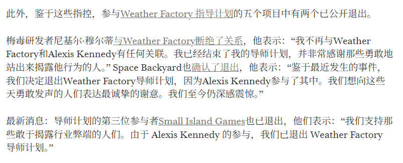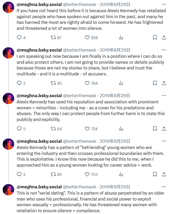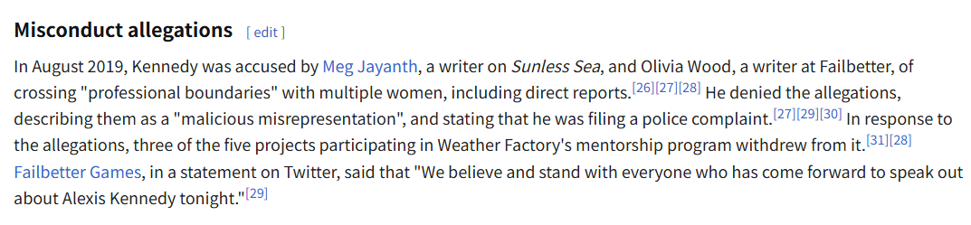 2019 年 8 月, 《无光之海》作者Meg Jayanth和 Failbetter 作家 Olivia Wood指控肯尼迪与多名女性(包括直接下属)跨越了“职业界限”。 他否认了这些指控,称其为“恶意虚假陈述”,并表示他正在向警方报案。作为对这些指控的回应,参与 Weather Factory 导师计划的五个项目中有三个退出了该计划。 Failbetter Games在推特上发表声明称,“我们相信并支持今晚站出来谈论亚历克西斯·肯尼迪的每个人。”