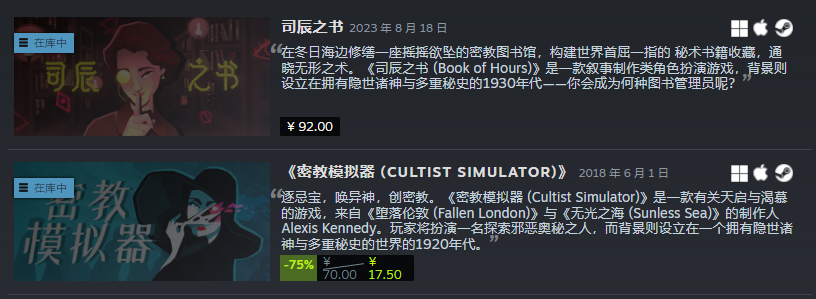 Weather Factory: 公司名下作品有《密教模拟器》Cultist Simulator《司辰之书》Book of Hours,新作Travelling At Night正在制作中